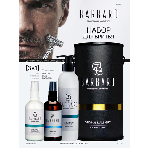 Набор для бритья BARBARO состоит из: подарочного брендированного тубуса, геля для бритья с ароматом Emerald, масла для бритья “Juniper”и бальзама после бритья с ароматом Emerald. Прекрасный набор для мужчины, который любит гладкое, чистое бритье и кожу без раздражения.