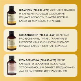 Шампунь и кондиционер для волос объемом 100 мл каждый. Шампунь обладает питательными свойствами и гарантирует глубокое восстановление волокна волос, укрепляя и улучшая их общее состояние. Кондиционер для волос обеспечивает глубокое питание и увлажнение, делая волосы мягкими и послушными.