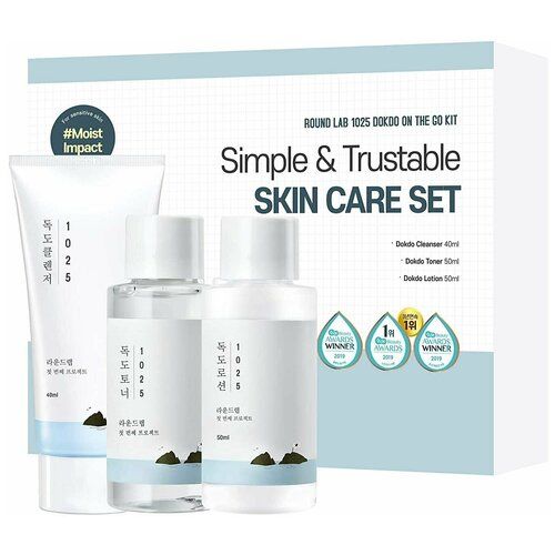 Набор для ухода за кожей Round lab 1025 Dokdo ON THE GO KIT (Тонер + Лосьон + Очищающее средство) включает в себя: