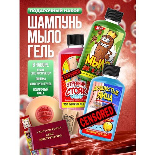 Подарочный набор "Прикол" - это идеальный подарок для мужчин, которые ценят юмор и оригинальность. В наборе вы найдете 1 флакон шампуня-геля для душа объемом 200 мл, 1 флакон геля для душа объемом 200 мл и 1 флакон жидкого мыла. Каждый флакон упакован в подарочную упаковку с прикольным подарком - Антистрессом Сис"кой в форме женской груди. Также в наборе вы найдете прикол - удостоверение ксива с прикольной надписью, подарочный пакет и линейку, а также шампунь для %лен, гель для яиц и шампунь для мытья яиц. Этот набор станет отличным подарком для любого мужчины с чувством юмора.