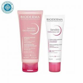 В набор входят два продукта: Мицеллярный гель для чувствительной кожи, 100 мл Гель для умывания Bioderma Sensibio мягко очищает кожу, даже самую чувствительную, в том числе и область вокруг глаз. Можно использовать для удаления макияжа. Благодаря успокаивающим активным компонентам быстро убирает покраснения и сухость. Средство гипоаллергенно и не закупоривает поры. Имеет высокую переносимость компонентов и не вызывает раздражения. Рекомендовано дерматологами. А за счет компактного формата гель удобно брать с собой в поездки. Насыщенный крем для чувствительной кожи Defensive, 40 мл Крем Sensibio Defensive подходит для чувствительной, сухой и очень сухой кожи. Богатая, обволакивающая текстура быстро впитывается, делая кожу мягкой и напитанной. Не оставляет липких следов. Крем не создает защитную пленку, а активирует самозащиту кожи. Эксклюзивное сочетание компонентов Defensive technology воздействует на источники чувствительности, предотвращая кожные реакции, окислительный стресс и изменения барьерной функции, вызванные повседневными агрессивными раздражителями.
