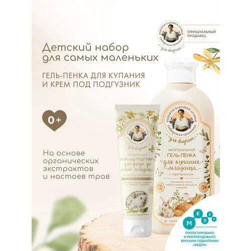 Чтобы малыш рос здоровеньким и крепким, используйте набор уходовой косметики «Сказочный лес». В нем гель-пенкадля купания и защитный крем под подгузник имеются. Гипоаллергенные формулы средств Рецепты бабушки Агафьи идеально подходят для ежедневного очищения и ухода с первых дней жизни. Успокаивающий гель пенка для подмывания 250 мл состоит из натуральных растительных компонентов и имеет нейтральный pH баланс. Отвар соцветий календулы и зверобоя увлажняет и оберегает нежную кожу детей, устраняет сухость и дискомфорт. Ромашковое масло противостоит шелушению и успокаивает. Детское жидкое мыло для интимной гигиены и умывания имеет мягкую консистенцию пены. Мытье с ним проходит без слез Все для комфорта Вашего малыша. Смягчающий и увлажняющий крем присыпка100 мл создан специально для защиты чувствительной кожи в области пеленания. Он создает невидимый барьер защиты на эпидермисе, предотвращает появление раздражений. Пантенол предупреждает возникновение опрелостей, дает смягчение и питание. Цинк подсушивает воспаления и уменьшает покраснение. Ромашка оказывает противовоспалительное, антисептическое и восстанавливающее действия. Органические экстракты чистотела и зверобоя обладают антибактериальным и заживляющим свойствами. Подарочный набор для ванны и душа 0 + для новорожденных мальчиков и девочек — хорошая идея, что можно подарить ребенку до 1 года на выписку из роддома, на День Рождения и Новый год. Комплект станет прекрасным новогодним и рождественским подарком под елку ребеночку до годика. Мы знаем, как важен правильный уход за нежной кожей младенца. Собрав лучшие рецепты сибирских травниц, проведя клинические испытания, мы создали детскую косметическую серию для самых наших дорогих и любимых. И ласково назвали её «Для внучат». Протестировано и рекомендовано врачами-педиатрами «Медси».