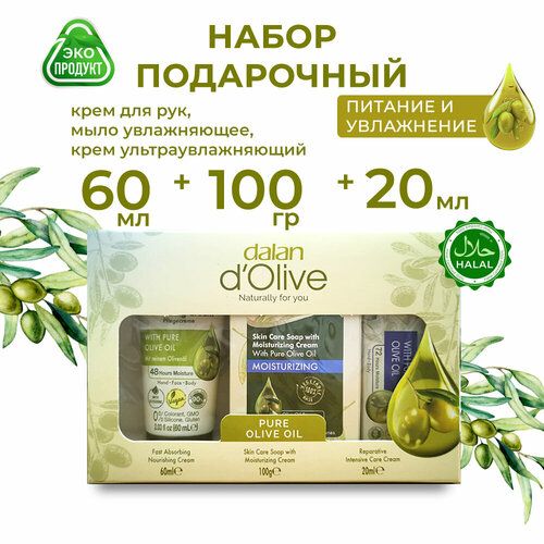 НАЙТИ ВЫГОДНЕЕ - Подарочный набор Dalan D'Olive турецкой косметики 180 гр: турецкий увлажняющий крем для лица, рук и тела 60 мл, мыло для рук 100 гр, интенсивный крем для рук и тела 20 мл