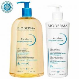 Набор состоит их двух продуктов Bioderma Atoderm, рекомендованных дерматологами. Набор может не иметь внешней упаковки, товары вкладываются в заказы по отдельности. Большой объем продуктов и экономичные дозаторы делают набор привлекательным для покупки. Масло для душа Bioderma Atoderm, 1 л Успокаивает и защищает от агрессивного воздействия окружающей среды. При использовании масло образует легкую пену с приятным ароматом, легко смывается, не раздражает слизистую глаз. Результатом ежедневного применения является чистая здоровая кожа, отсутствие зуда и раздражений. Увлажняющее действие сохраняется на протяжении 24 часов. Подходит для семейного использования. Срок годности после вскрытия – 6 месяцев. Бальзам Bioderma Atoderm Intensive, 500 мл Помогает снять симптомы, сопровождающие сухую, очень сухую и атопичную кожу. Средство успокаивает, быстро устраняет зуд и помогает справиться с расчесами. У 76% людей, использующих этот продукт, после шести месяцев пропадают неприятные симптомы. Бальзам также качественно и надолго увлажняет кожу. Его действия хватает на 24 часа. Срок годности после вскрытия – 6 месяцев.