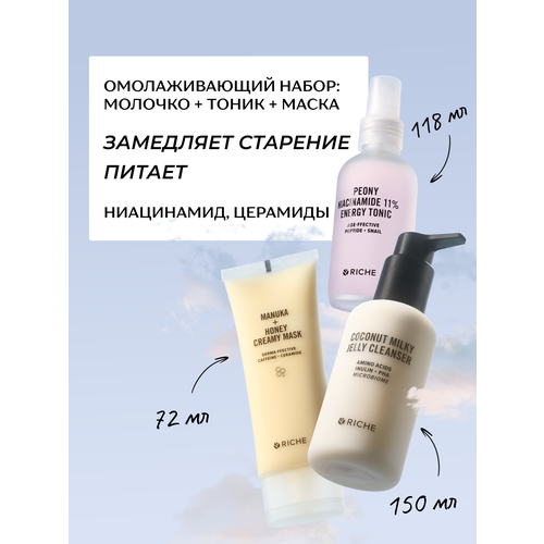 НАЙТИ ВЫГОДНЕЕ - Омолаживающий набор уходовой косметики для лица RICHE: Кокосовое молочко для умывания + Питательная лифтинг-маска для лица + Тоник омолаживающий и увлажняющий с ниацинамидом Рише