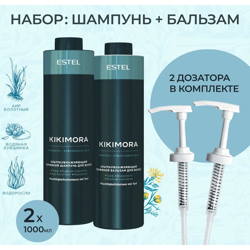 Набор KIKIMORA от Estel Professional представляет собой косметический набор, состоящий из ультраувлажняющего торфяного шампуня объемом 1000 мл, бальзама для волос такого же объема и двух дозаторов.