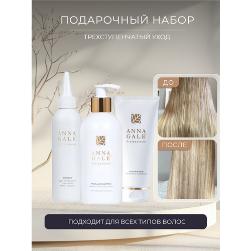 Премиальный набор уходовой косметики трехступенчатый Бокс с косметикой для женщин от ANNA GALE это профессиональный уход за волосами и кожей головы. Косметические средства позволяют отращивать здоровые и густые волосы у корней, и омолаживать по всей длине. За присланные фотографии результата до и после даем подарок Набор для волос для девочек, женщин или девушек. Подарочный набор воспитателю на день воспитателя."Будучи сертифицированным трихологом и дерматологом, я точно знаю, как помочь женщинам быть красивыми. Поэтому я собрала команду лучших профессионалов со всего мира, чтобы создать самую эффективную косметику для профессионального ухода за лицом, телом и волосами. Косметика носит мое имя ANNA GALE, и я несу личную ответственность за ее результат".