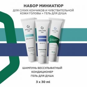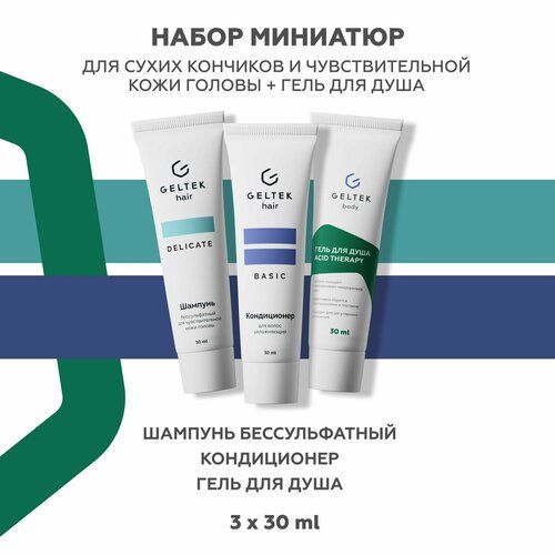 НАЙТИ ВЫГОДНЕЕ - Дорожный набор Гельтек шампунь бессульфатный, бальзам для волос увлажняющий и гель для душа с кислотами Acid Therapy
