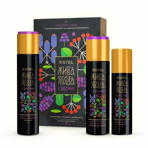 В составе: Шампунь-приворот для волос ESTEL Жива Ягода сказочная 300мл, Бальзам-оберег для волос ESTEL Жива Ягода сказочная 250мл и Спрей-чаровник для волос ESTEL Жива Ягода сказочная 200мл