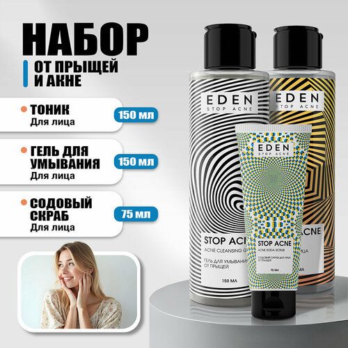 Набор от прыщей и акне EDEN Stop Acne - это комплексное решение для ухода за проблемной кожей. В состав набора входят три средства: гель для умывания, тоник для лица и содовый скраб.