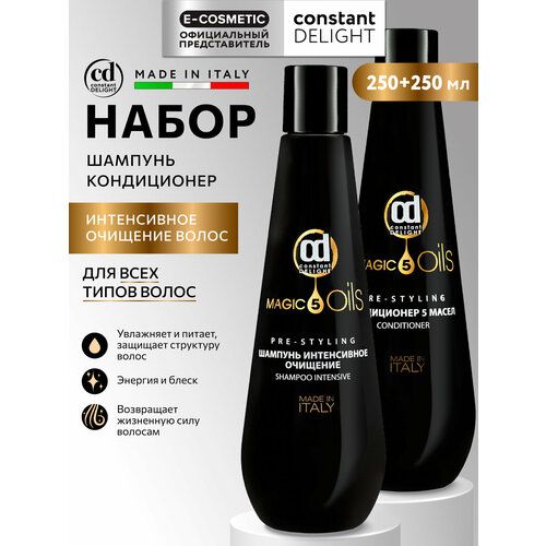 Профессиональный набор шампунь 250 мл и кондиционер 250 мл CONSTANT DELIGHT MAGIC 5 OILS с богатой питательной формулой на основе пяти ценных масел: макадамии, хлопка, жожоба, авокадо и арганы для восстановления и защиты волос. Подходит для всех типов от тонких и ослабленных, до густых и жестких.