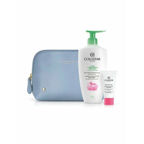 В подарочный набор "Увлажнение лица и тела" от Collistar входит: 1. Флюид глубокого увлажнения для тела Deep Moisturizing Fluid, объём 400 мл; 2. Увлажняющий крем для лица Idro-Attiva -Deep Moisturizing Cream, объём 25мл .