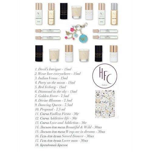 Подарочный набор HFC Paris – это не только идеальный подарок для ваших близких, но и уникальная возможность познакомиться с культовым брендом. Эксклюзивный набор HFC Paris, наполненный роскошными угощениями, порадует даже самых взыскательных ценителей нишевой парфюмерии. Эксклюзивный лимитированный набор HFC Paris, наполненный роскошными лакомствами: гелями для душа, различными ароматами, ароматическими свечами и стильным шармом, выпущенным ограниченным тиражом.