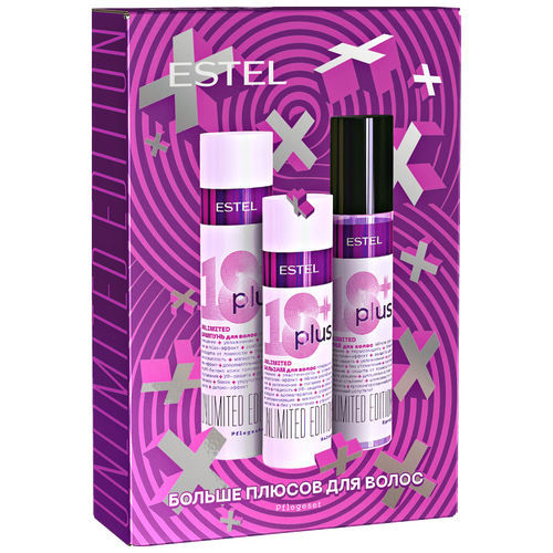 Набор 18 PLUS предназначен для многофункционального ежедневного ухода за волосами. Средства подходят для ежедневного применения в салоне красоты и дома. Набор включает: Шампунь для волос ESTEL 18 PLUS, 250 мл 18+. Для многофункционального ежедневного ухода за волосами. В сочетании с бальзамом обеспечивает эффект салонной процедуры. Бальзам для волос ESTEL 18 PLUS, 200 мл 18+. Для многофункционального ежедневного ухода за волосами. В сочетании с шампунем обеспечивает эффект салонной процедуры. Спрей для волос ESTEL 18 PLUS, 200 мл 18+. Лёгкая консистенция способствует быстрому проникновению ухаживающих компонентов и не утяжеляет волосы. Подходит для ежедневного применения в салоне красоты и дома.