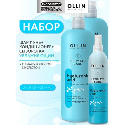 НАЙТИ ВЫГОДНЕЕ - Косметический набор для интенсивного увлажнения волос OLLIN PROFESSIONAL Ultimate Care с гиалуроновой кислотой: шампунь, кондиционер и сыворотка, 2*1000+50 мл