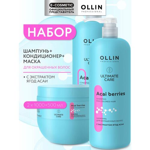 НАЙТИ ВЫГОДНЕЕ - Набор для окрашенных волос OLLIN PROFESSIONAL Ultimate Care с экстрактом ягод асаи: шампунь, кондиционер и маска, 2*1000+500 мл