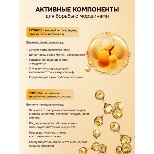 Ретинол - это антиоксидант, форма витамина А, который улучшает защитную функцию кожи, обогащает витаминами, тонизирует, осветляет пигментные пятна и постакне, увлажняет, омолаживает и удерживает влагу. Пептиды стимулируют синтез коллагена, эластина, гиалуроновой кислоты, ускоряют регенерацию клеток, восстанавливают ткани и замедляют старение.