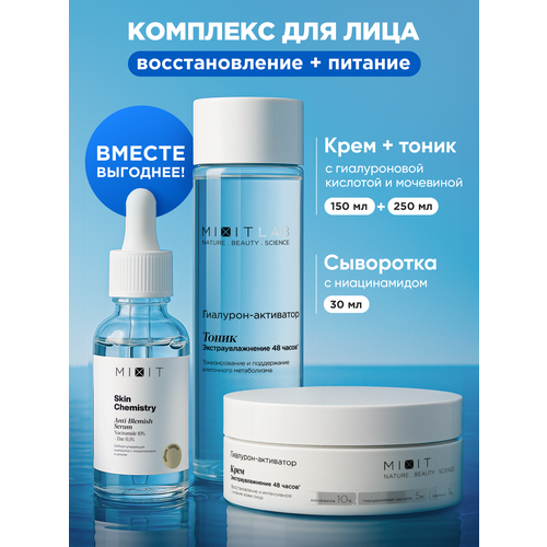 Миксит Подарочный увлажняющий набор для профессионального ухода за кожей лица WOW Moisture. В уходовый комплекс входит очищающий тоник Tonic, успокаивающий крем Cream и противовоспалительная сыворотка Skin Chemistry Anti Blemish Serum. Освежающий тонер обеспечивает восстановление ph баланса, глубокое увлажнение и очистку, отбеливание пигментных пятен и постакне. Удаляет загрязнения, с которыми не справилась умывашка, ускоряет отшелушивающие процессы и устраняет ощущение сухости, не требует смывания. Антивозрастной крем направлен на интенсивное питание, выравнивание морщин и осветление пигментации. Подходит как база под макияж. Матирующий серум интенсивно борется против прыщей и черных точек. Средство ускоряет регенерацию и отбеливает тон, обеспечивает легкий пилинг и выравнивает рельеф. Сыворотка способствует сужению пор, устранению жирного блеска и постакне. Средства из бьюти бокса с натуральным составом без спирта для красоты и здоровья вашей кожи.