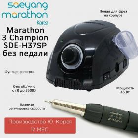 Marathon 3 Champion New - аппарат для маникюра с наконечником SDE-H37SP, без педали. Скорость от 0 до 35000 об/мин, крутящий момент 3.2 Н/см, мощность 45 Вт, производство Saeyang Microtech (Ю. Корея) с гарантией в официальных сервисных центрах по всей России 1 год.