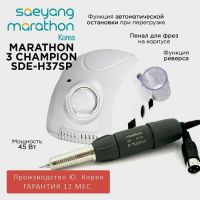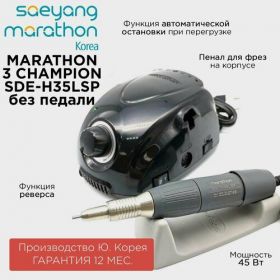 Marathon 3 Champion New - аппарат для маникюра с наконечником SDE-H35LSP, без педали. Скорость от 0 до 35000 об/мин, крутящий момент 3.2 Н/см, мощность 45 Вт, производство Saeyang Microtech (Ю. Корея) с гарантией в официальных сервисных центрах по всей России 1 год.