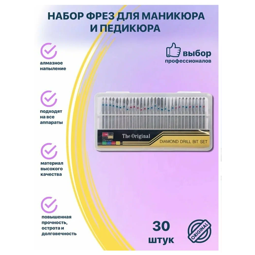 Набор фрез для аппаратного маникюра и педикюра в пластиковом органайзере. В набор входят 30 фрез разного диаметра и абразивности. Фрезы содержат алмазную пыль, благодаря которой являются прочными. Каждая маникюрная фреза имеет индивидуальную форму. Фрезы предназначены для выполнения многочисленных задач в процессе аппаратного ухода за ногтями и кожей: коррекция и создание формы ногтя, выпиливание затекших материалов при наращивании, обработка кутикулы, снятие гель-лака и др. В комплект входят насадки с коническим, эллипсообразным, шарообразным, цилиндрическим и острым наконечником. Абразивность определяется по цвету полоски: красный - мекая, синий - средняя. Высота фрезы 4,5 см. Диаметр хвостовика фрезы -2,35 мм.