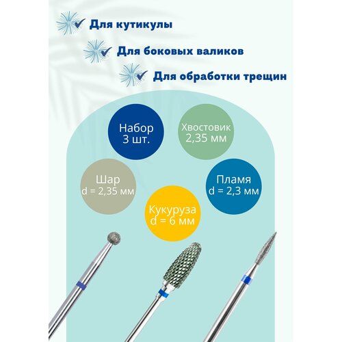Набор фрез для аппаратного маникюра включает в себя три фрезы разных размеров и форм: