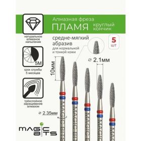 Фрезы Magic Bits. Набор из 5 штук. Новые уникальные алмазные фрезы с натуральной крошкой собственного производства в Санкт-Петербурге. Внимание Фреза Пламя предназначена для маникюра и педикюра. Используется для поднятия кутикулы и дальнейшего ее среза, а также для вычищения птеригия из под кутикулы и в боковых валиках. Для идеального результата необходимо подобрать оптимальный размер и абразивность. Для продления срока службы фрез необходимо тщательно очищать инструмент от эпидермиса после использования, желательно, с применением УЗ-мойки. Также необходимо соблюдать правила стерилизации, во избежание порчи инструмента.