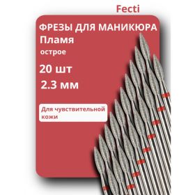 Набор маникюрных фрез Fecti Пламя предназначен для аппаратного маникюра и педикюра. В комплекте вы найдете 20 фрез с острым кончиком диаметра 2.3 мм, которые применяются для раскрытия бокового валика, срезания и поднятия кутикулы, обработки трещин, мозолей, стержневых мозолей и неровностей при работе со стопами.