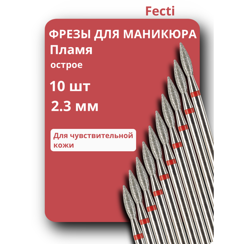 Набор маникюрных фрез Fecti "Пламя" предназначен для аппаратного маникюра и педикюра. В комплекте вы найдете 10 фрез с острым кончиком диаметра 2.3 мм, которые применяются для раскрытия бокового валика, срезания и поднятия кутикулы, обработки трещин, мозолей, стержневых мозолей и неровностей при работе со стопами.