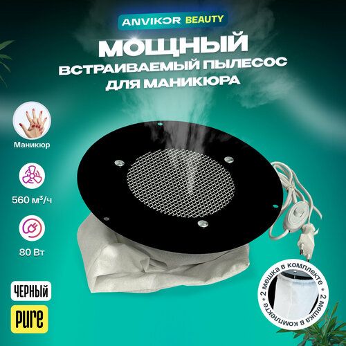 Встраиваемый пылесос для маникюра Anvikor Pure надежно защитит мастера и клиента от крупных частиц ногтевого опила. Устройство монтируется в рабочий стол нейл-мастера: основная часть с пылесборником располагается внизу, а на поверхности находится решетка пылесоса. Продуманная конструкция позволяет увеличить рабочее пространство и разместить на столе нужные приборы и принадлежности. Мощный вентилятор с потоком воздуха 560 м³/ч мгновенно всасывает опил, не давая ему распространяться по всему салону, загрязнять стол и одежду. Металлические части встраиваемого пылесоса окрашены порошковой краской — устройство смотрится эстетично, цвет равномерный и без потеков. Специальных средств для ухода за встроенным пылесосом не требуется: достаточно убирать мягкой салфеткой пыль с лицевой стороны. Пылесборник нужно вытряхивать по мере его наполнения. В комплекте с пылесосом-вытяжкой поставляется два мешка и трафарет для вырезания отверстия в столе. Устройство отлично работает в тандеме с профессиональной напольной вытяжкой для маникюра, которая всасывает мелкодисперсные частицы и не дает им оседать в дыхательных путях и слизистых.
