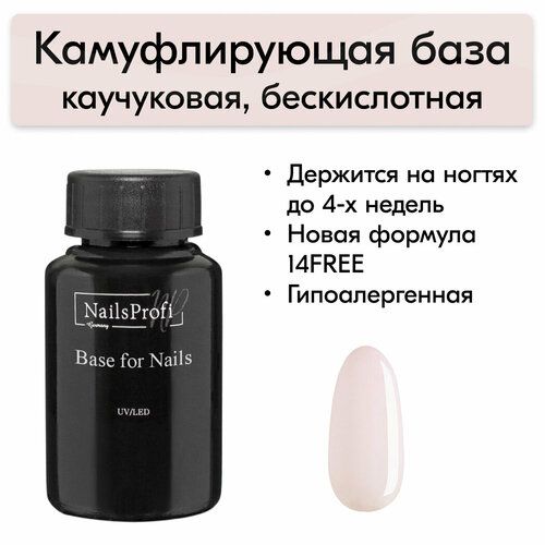 Способ применения: на подготовленную ногтевую пластину нанести в один/два слоя камуфлирующую базу просушить каждый слой отдельно, запечатать торцы, сушить в LED-лампе 60 сек или UV-лампе 120сек.