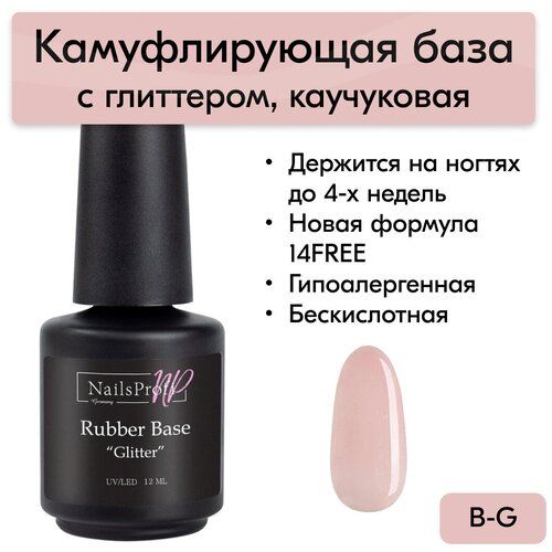 НАЙТИ ВЫГОДНЕЕ - NailsProfi, База для ногтей каучуковая с глиттером, шиммером, блестками, 14FREE, Rubber Base Glitter - 12 мл