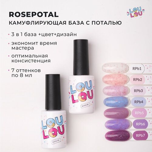 Набор камуфлирующих баз для ногтей и маникюра с розовой поталью Rosepotal LOULOU - это невероятно красивый набор из 7 оттенков цвета розы от нежно-розового до фиолетового, представленный в красивом боксе. Каждая камуфляжная база в наборе содержит переливающиеся частички потали, которые создают красивое мерцание на вашем маникюре. Формула продукта отличается хорошей самовыравнивающейся текстурой и оптимальной консистенцией, что позволяет легко и равномерно наносить камуфлирующую базу на ногти. Частички потали распределяются равномерно по поверхности ногтя, создавая уникальный эффект и украшая ваш маникюр. Набор камуфлирующих баз для ногтей с поталью Rosepotal LOULOU является универсальным решением, так как одновременно выполняет три функции: нанесение цвета, дизайна и базы. Набор камуфлирующих баз для маникюра с поталью Rosepotal LOULOU - это идеальный выбор для тех, кто хочет добавить немного сияния в свой образ. С ним вы сможете создать неповторимые и запоминающиеся маникюры, которые привлекут восхищенные взгляды окружающих. Брендовые наклейки на типсы входят в набор и Вы получите их в подарок.