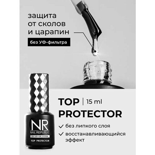 NR TOP PROTECTOR без UV фильтра (15 мл), Топ для ногтей с отличными характеристиками идеально подходит для завершения маникюра и педикюра. Обеспечивает надежное покрытие, укрепление и защиту ногтя после нанесения лака. Каждый топ в Nail Republic предназначен для создания разных эффектов: матовый, глянцевый, с блестками или шиммером.