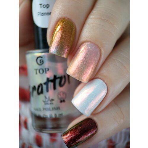 Grattol Top Pioneer – топ для ногтей с красным шиммером и эффектом цветового преображения. Создает многослойный 3D-эффект с переливами от красного и кораллово-оранжевого к золотистому с изумрудным отливом. Универсальное покрытие с самовыравнивающейся формулой, наносится в 1-2 слоя на любые основы. Идеально раскрывается на темных подложках (черный, бордовый, синий). Сохнет 3-5 минут.