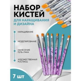 3004708 Набор кистей для наращивания и дизайна ногтей, плоские, 7 шт, 14 см, №2/4/6/8/10/12/14, цвет сиреневый Целый набор кистей для наращивания ногтей пригодится для создания оригинального маникюра. Аксессуары, подходящие для профессионального использования, позволят вам самостоятельно моделировать дизайн ногтей.