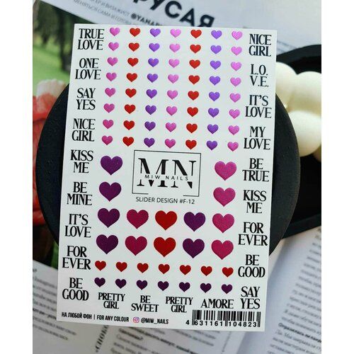 НАЙТИ ВЫГОДНЕЕ - MIW Nails Слайдеры для ногтей водные наклейки для дизайна #F-12 фольгированный текст, слова, сердце