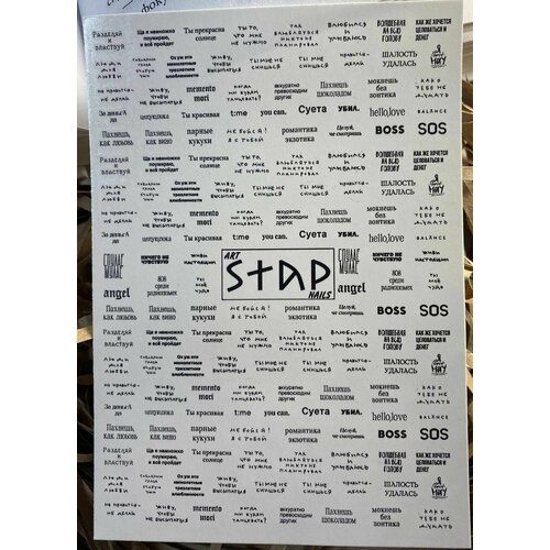 Наш набор слайдеров для ногтей включает в себя разнообразные элементы, которые позволят вам проявить свою творческую индивидуальность. Здесь сочетание смешных и трендовых фраз из мемов, строки популярных песен, цитаты из фильмов и книг, разнообразие шрифтов на любой вкус. Вы сможете создавать дизайны, которые будут привлекать взгляды и вызывать улыбки. Наш набор идеально подходит как для профессиональных мастеров маникюра, которые стремятся удивить своих клиентов уникальным дизайном, так и для начинающих, которые только начинают осваивать искусство ногтевого сервиса. Легко наносятся разными способами, включая стемпинг. Подойдут на натуральные, наращенные и накладные ногти рук и ног. С помощью водных наклеек на плотной бумаге вы сможете быстро и легко создавать неповторимые дизайны, не требующие особых усилий и времени. Наши материалы отличаются высоким качеством и долговечностью. Они сохраняют свою насыщенность на ногтях в течение длительного времени, не выцветают и не выгорают. Это означает, что вашему маникюру или педикюру будет радовать вас и ваших клиентов насыщенными и яркими цветами на протяжении длительного времени. Не упустите возможность приобрести наш набор слайдеров для маникюра и педикюра по выгодной цене и добавить своим творческим проектам новые интересные идеи и дизайны. Порадуйте себя и своих клиентов уникальными ногтевыми идеями, которые точно вызовут восторг и восхищение у окружающих