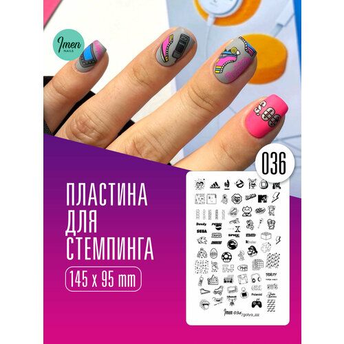 Представляем тебе "Имень пластину для стемпинга 036" - идеальное решение для создания современного и изысканного дизайна. Любимые герои из детства, Масяня, Барби, MTV, Сникерс, Чупа-Чупс, Марио. Эта пластина размером 145*95 мм является неотъемлемым инструментом в арсенале любого маникюрного мастера. Без пластиковой подложки, она обеспечивает максимальное удобство в использовании и позволяет воплотить любую твою идею в жизнь. Принты на пластине для стемпинга впечатляют своим разнообразием и оригинальностью. Ты легко сможешь создать неповторимый дизайн, будь то осенние мотивы, животные принты или новогодний праздник. Придай своим ногтям волшебство и радость с помощью пластины для стемпинга. Новогодний декор для маникюра, который придаст твоим ногтям неповторимый и стильный вид Перед использованием тщательно протереть пластину ацетонсодержащей жидкостью. 1. Нанести лак для стемпинга (гель-пасту или др.) 2. Скрапером снять излишки материала. 3. Перенести рисунок на подготовленный, очищенный штамп. 4. Перенести рисунок на ногтевую пластину.5. Очистить штамп.6. Очистить пластину ацетоном.7. Перекрывать рисунок нужно специальным топом для слайдеров. так же можно перекрыть топом с липким слоем, высушите в лампе, а затем топом без л/с.