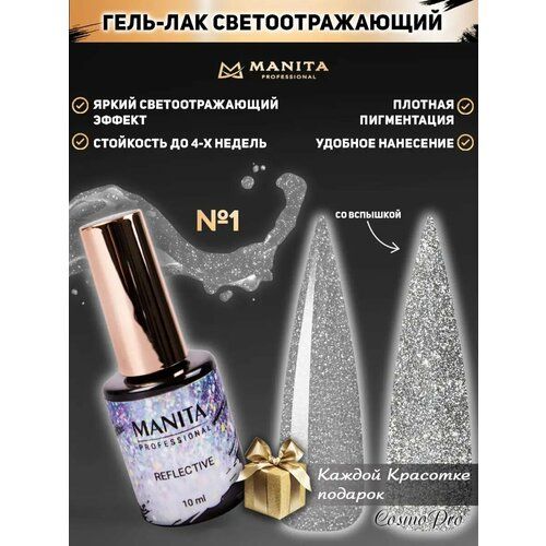 Яркий мерцающий маникюр с безопасными гель-лаками Reflective Manita Professional - это не просто модно, это по-настоящему завораживает Профессиональный гипоаллергенный гель лак для ногтей с блестками высокопигментированный, т. е плотный, поэтому его нужно наносить максимально тонким слоем - как первый, так и последующие. И каждый слой обязательно хорошо просушить в лампе. Светоотражающий эффект с первого слоя. Легко наносится хорошей, удобной кистью и прекрасно ложится в четкую линию у кутикулы. Самовыравнивающийся, не морщится и не стягивается к центру ногтя. Стойкий блеск, не теряющий яркости после нанесения топа или воздействия ультрафиолета и носится до 6-ти недель. Без неприятного запаха. А дизайн для ногтей с ним получается просто нереальным