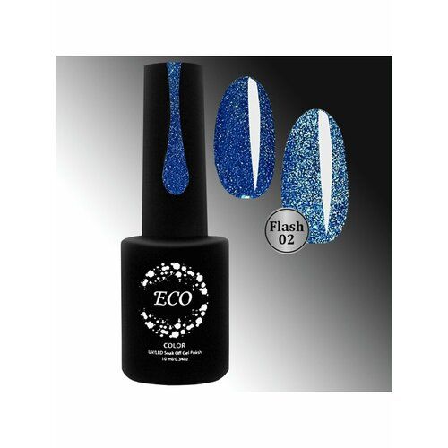 Светоотражающий гель-лак для ногтей ТМ ECO "FLASH" №02 - синий, полупрозрачный с большим количеством синих светоотражающих блесток.