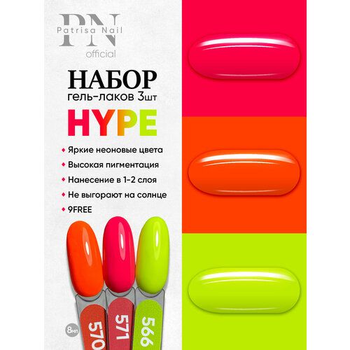 НАЙТИ ВЫГОДНЕЕ - Набор неоновых гель-лаков для ногтей Patrisa Nail Hype №566, 570, 571, по 8 мл