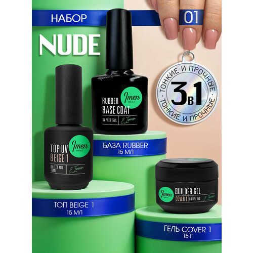 НАЙТИ ВЫГОДНЕЕ - Imen Набор Nude 1 для тонких и прочных ногтей бежевый ( каучуковая база, билдер гель, топ)