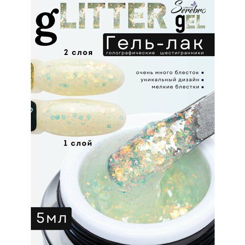 НАЙТИ ВЫГОДНЕЕ - Гель - лак для ногтей Serebro Glitter, прозрачный, голографические шестигранники, 5 мл.