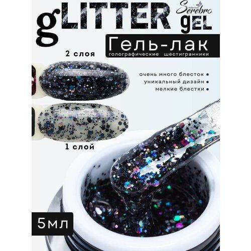 НАЙТИ ВЫГОДНЕЕ - Гель - лак для ногтей Serebro Glitter, черный, голографические шестигранники, 5 мл.