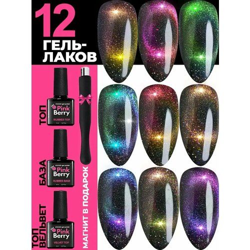 НАЙТИ ВЫГОДНЕЕ - Набор гель лаков для ногтей светоотражающий кошачий глаз хамелеон с базой и топом от Pinkberry из 12 цветов по 8 мл