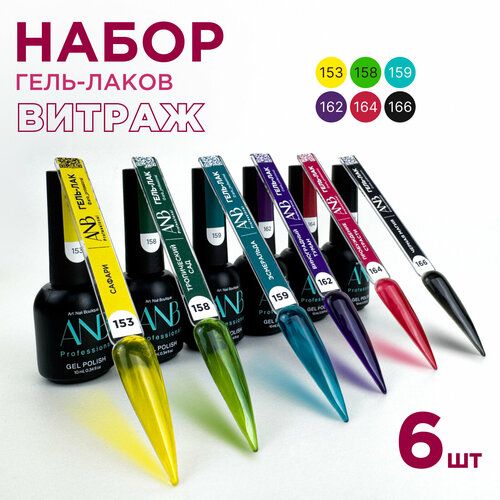 Профессиональный витражный набор гель-лаков для ногтей витраж включает в себя 6шт ярких оттенков по 10мл (153, 158, 159, 162, 164, 166). Имеют насыщенный глубокий полупрозрачный цвет. Благодаря новой формуле они самовыравниваются и не полосят на ногтях. Сильно пигментированные и имеют липкий слой. Не выцветает и не скалывается. Гель лак наносится легкими движениями эргономичной и упругой кисточкой в два слоя и не имеет химического запаха. Подходит для нежного фреча (французский) и дерзкого дизайна для маникюра и педикюра. С помощью палитры ANB Professional ваш маник будет стильным и элегантным. В коллекции от АНБ есть темные и светлые оттенки, натуральные нюдовые и витражные цвета, красный, фуксия, синий, розовый и бородовый, молочный и другие оттенки. С нашей палитрой цветов легко можно сделать летний, осенний, зимний и весенний дизайн. Все цвета обладают стойкостью до 6 недель. Как только Вы остановите свой выбор на определенном цвете, вы всегда можете его дополнить светоотражающими блестками, стразами или хлопьями юки. Гель лаки представлены в объеме 10мл. В комплекте к каждому лаку идет наклейка на типсу.