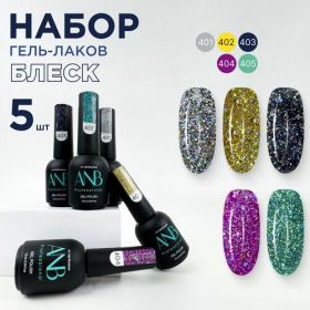 Профессиональный набор гель-лаков для ногтей с блестками блеск включает в себя 5шт ярких оттенков по 10мл (401, 402, 403, 404, 405). Имеет яркий, насыщенный глубокий, плотный цвет. Невероятный эффект блеска, от шиммера с блёстками, создадут потрясающий дизайн на ваших ногтях. Благодаря новой формуле они самовыравниваются и не полосят на ногтях. Сильно пигментированные и имеют липкий слой. Гель лак наносится легкими движениями эргономичной и упругой кисточкой в два слоя и не имеет химического запаха. Подходит для нежного фреча (французский) и дерзкого дизайна для маникюра и педикюра. С помощью палитры ANB Professional ваш маник будет стильным и элегантным. В коллекции от АНБ есть темные и светлые оттенки, нюдовые, молочные и витражные цвета, несколько оттенков красного и розового, синего и серых, а также коричневых кракелюр и других цветных гель лаков. С нашей палитрой цветов легко можно сделать летний, осенний, зимний и весенний дизайн. Как только Вы остановите свой выбор на определенном цвете, вы всегда можете его дополнить светоотражающими блестками, стразами или хлопьями юки. Все цвета обладают стойкостью до 6 недель. В комплекте к каждому лаку идет наклейка на типсу.