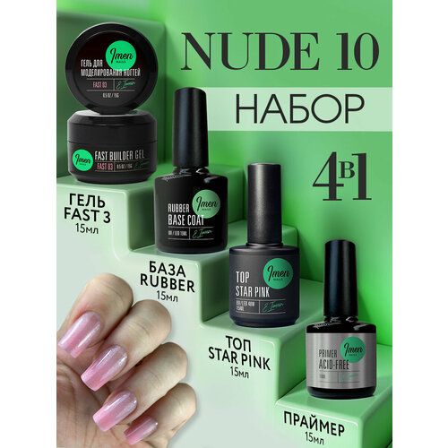 НАЙТИ ВЫГОДНЕЕ - Imen Набор Nude 10 Тонкие и прочные ( бескислотный праймер, каучуковая база, жидкий гель, розовый топ с шиммером)