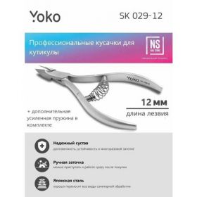 Кусачки Yoko SK 029-12 - это профессиональный инструмент высокого качества с увеличенной длиной режущей кромки 12 мм. В комплект входит дополнительная усиленная пружина. Кусачки производятся из японской высоколегированной нержавеющей стали и отличаются превосходным качеством изготовления сустава - важнейшего конструктивного элемента маникюрных кусачек. Инструменты Yoko могут подвергаться всем необходимым обработкам. Важно использовать химические средства с PH более 7 и не нагревать свыше 300 градусов Цельсия. Спиральная пружина, режущая кромка 12 мм, длина инструмента 118 мм